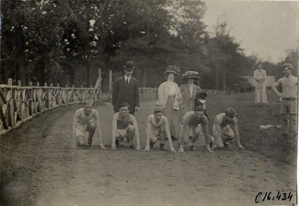 View of runners at start of race at track meet. Two women spectators and official holding starter pistol stand behind runners. Stamped on back: "Spooner & Wells, Inc., photographers, telephones 3472-3473 Columbus, 1931 Broadway, New York." Handwritten on back: "Sporting events--Track and field, 1909."