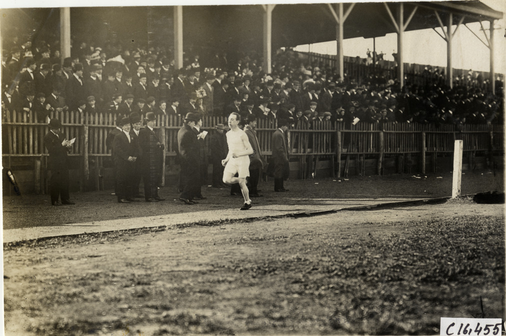 View of runner competing in race at track meet. Spectators in grandstand and officials standing in front of fence in background. Stamped on back: "Spooner & Wells, Inc., photographers, telephones 3472-3473 Columbus, 1931 Broadway, New York." Handwritten on back: "Sporting events--Track and field, 1909."