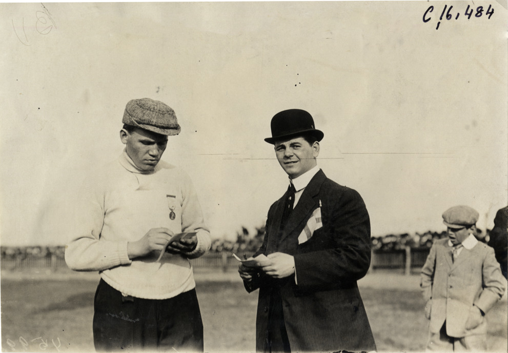 Favorite this☆ Officials at track meet Description: View of two officials, holding pencils and notepads, at track meet. Stamped on back: "Spooner & Wells, Inc., photographers, telephones 3472-3473 Columbus, 1931 Broadway, New York." Handwritten on back: "Sporting events--Track and field, 1909." Details Resource ID: na018144 Creator: Spooner & Wells Subject: Sports officials Track and field--Tournaments Photographers--New York (State)--New York Photographic prints Date Issued: 1909 Format: 1 photographic print ; 4.75 x 6.75 in. Member of: National Automotive History Collection Lazarnick Collection Filing Location: Sporting events--Track and field, 1909 #7 Negative Number: Negative #C16,484 Rights: Physical rights are retained by DPL. Copyright is retained in accordance with U.S. copyright laws.
