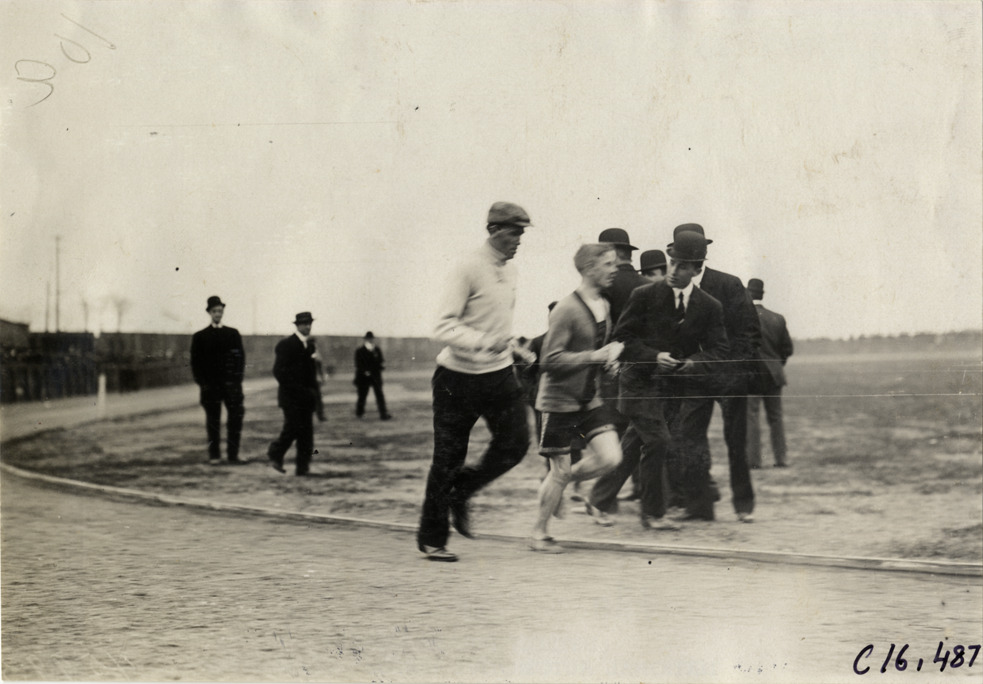 View of two officials running alongside runner at track meet. Group of officials stand in background. Stamped on back: "Spooner & Wells, Inc., photographers, telephones 3472-3473 Columbus, 1931 Broadway, New York." Handwritten on back: "Sporting events--Track and field, 1909."