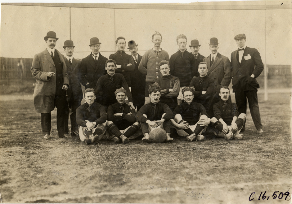 Favorite this☆ Soccer team Description: Group portrait of soccer players, coaches and officials. Stamped on back: "Spooner & Wells, Inc., photographers, telephones 3472-3473 Columbus, 1931 Broadway, New York." Handwritten on back: "Sporting events--Track and field, 1909." Details Resource ID: na018168 Creator: Spooner & Wells Subject: Soccer teams Soccer players Soccer coaches Sports officials Portraits, Group Photographers--New York (State)--New York Photographic prints Date Issued: 1909 Format: 1 photographic print ; 4.5 x 6.5 in. Member of: National Automotive History Collection Lazarnick Collection Filing Location: Sporting events--Track and field, 1909 #8 Negative Number: Negative #C16,509 Rights: Physical rights are retained by DPL. Copyright is retained in accordance with U.S. copyright laws.
