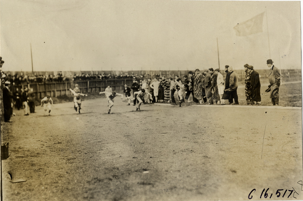 View of runners at start of race at track meet. Spectators and officials watch from sidelines. Stamped on back: "Spooner & Wells, Inc., photographers, telephones 3472-3473 Columbus, 1931 Broadway, New York." Handwritten on back: "Sporting events--Track and field, 1909."