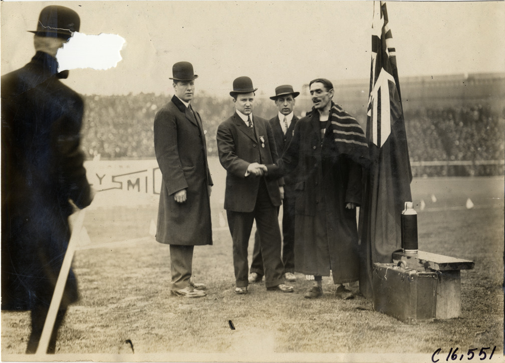 View of runner Alfred "Alfie" Shrubb shaking hands with an official during marathon race. Shrubb wears long coat and stands next to flag. Two officials stand in background; thermos and suitcase on right. Stamped on back: "Spooner and Wells, 1931 Broadway, New York, duplicates any time, enlargements all sizes, tel. 3472-3473 Col., credit appreciated." Handwritten on back: "Schrubb [sic]. Sporting events--Track and field, 1909."