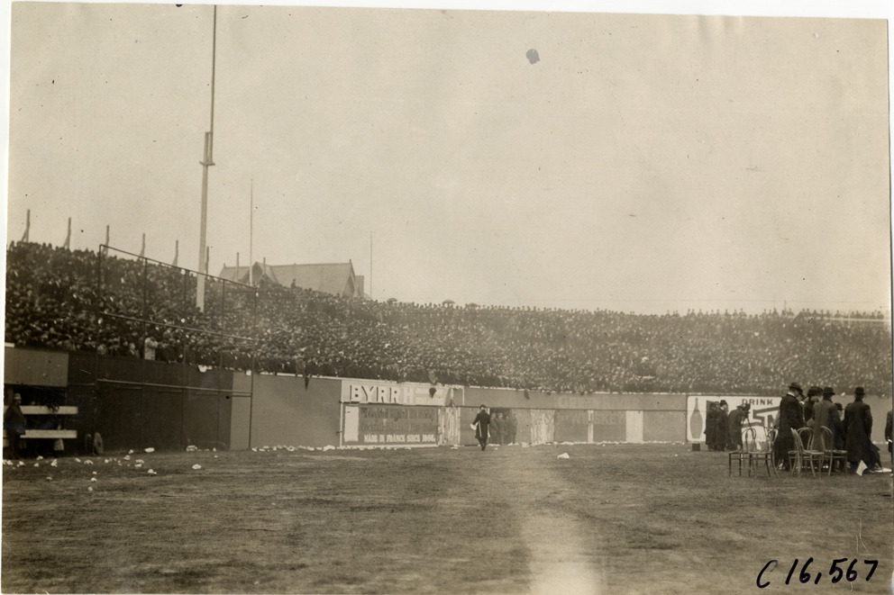 View of spectators in stands during marathon race; group of officials on right. Handwritten on back: "Sporting events--Track and field, 1909."