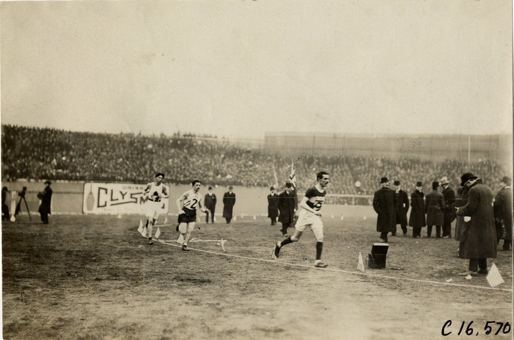 View of Alfred Shrubb leading Tom Longboat and Dorando Pietri in marathon race. Grandstand in background; officials in center of track. Handwritten on back: "Schrubb [sic]. Sporting events--Track and field, 1909."