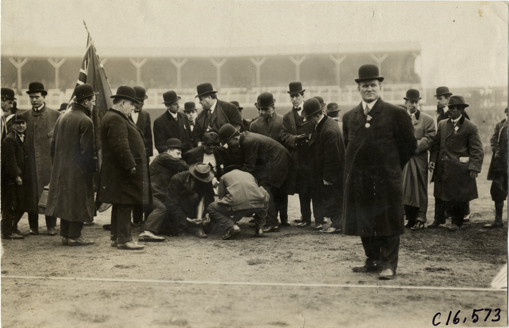 View of group of officials with runner Tom Longboat on side of track during marathon race; one man holds a flag. Grandstand in background. Stamped on back: "Spooner and Wells, 1931 Broadway, New York, duplicates any time, enlargements all sizes, tel. 3472-3473 Col., credit appreciated." Handwritten on back: "Sporting events--Track and field, 1909."