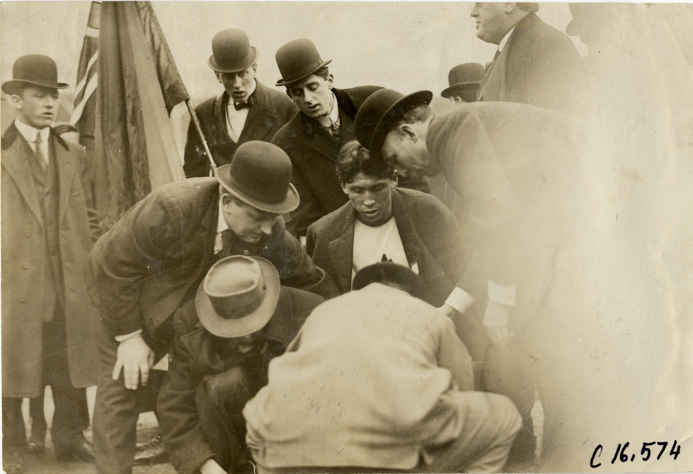 Close-up view of group of officials with runner Tom Longboat on side of track during marathon race; one man holds a flag. Stamped on back: "Spooner and Wells, 1931 Broadway, New York, duplicates any time, enlargements all sizes, tel. 3472-3473 Col., credit appreciated." Handwritten on back: "Sporting events--Track and field, 1909."
