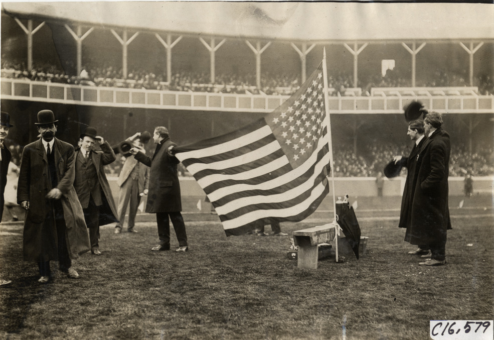View of several officials standing around large American flag in center of track at marathon race. Grandstand in background. Handwritten on back: "Hayes colors. Sporting events--Track and field, 1909."