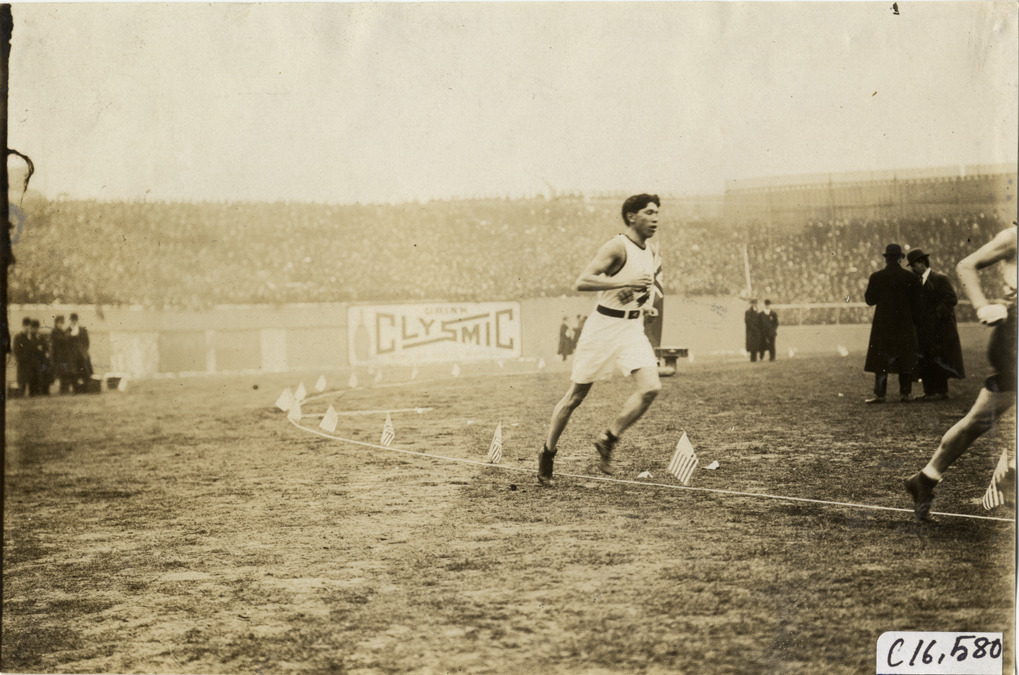 View of Tom Longboat running in marathon race. Grandstand in background. Stamped on back: "Spooner & Wells, Inc., photographers, telephones 3472-3473 Columbus, 1931 Broadway, New York." Handwritten on back: "Longboat. Sporting events--Track and field, 1909."