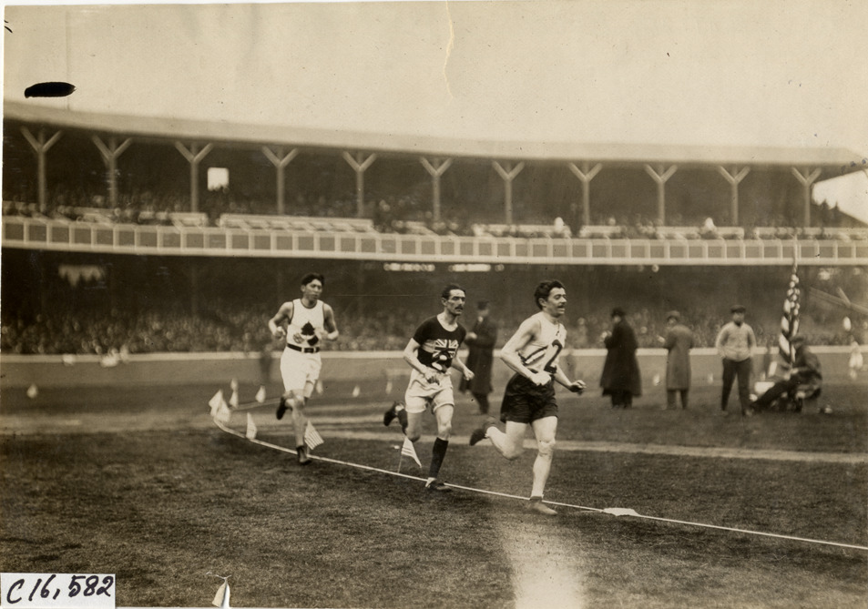 View of Dorando Pietri leading Tom Longboat and Alfred Shrubb in marathon race. Grandstand in background. Handwritten on back: "Dorando leading Schrubb [sic] & Longboat. Sporting events--Track and field, 1909."
