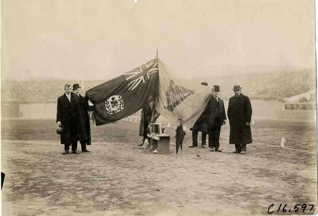 View of officials displaying Irish and British flags in center of track at marathon race. Handwritten on back: "Schrubb [sic] & Maloney colors. Sporting events--Track and field, 1909."