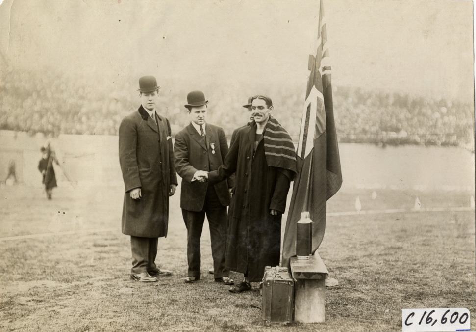 View of runner Alfred "Alfie" Shrubb shaking hands with official at marathon race. Shrubb wears long coat and stands next to flag; suitcase and thermos in foreground. Two officials stand in background. Stamped on back: "Spooner and Wells, 1931 Broadway, New York, duplicates any time, enlargements all sizes, tel. 3472-3473 Col., credit appreciated." Handwritten on back: "Schrubb [sic], [undecipherable], May 8th, 1909. Sporting events--Track and field, 1909."