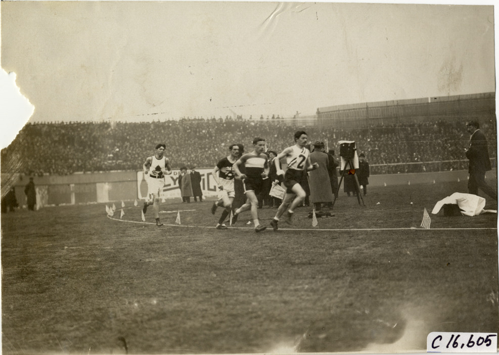 View of Dorando Pietri leading Tom Longboat, Alfred Shrubb and Henri St. Ives in marathon race. Officials and photographers with cameras in center of track; grandstand in background. Stamped on back: "Spooner & Wells, Inc., photographers, telephones 3472-3473 Columbus, 1931 Broadway, New York." Handwritten on back: "Marathon Derby. Dorando, St. Ives, Schrubb [sic], Longboat. Sporting events--Track and field, 1909."