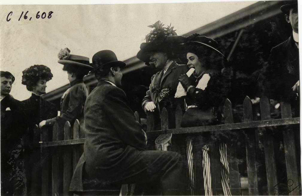 Favorite this☆ Man speaking with two women at track meet Description: View of man speaking with two women in grandstand at track meet. Handwritten on back: "Sporting events--Track and field, 1909." Details Resource ID: na018267 Subject: Sports spectators Track and field--Tournaments Photographic prints Date Issued: 1909 Format: 1 photographic print ; 4.25 x 6.75 in. Member of: National Automotive History Collection Lazarnick Collection Filing Location: Sporting events--Track and field, 1909 #12 Negative Number: Negative #C16,608 Rights: Physical rights are retained by DPL. Copyright is retained in accordance with U.S. copyright laws.