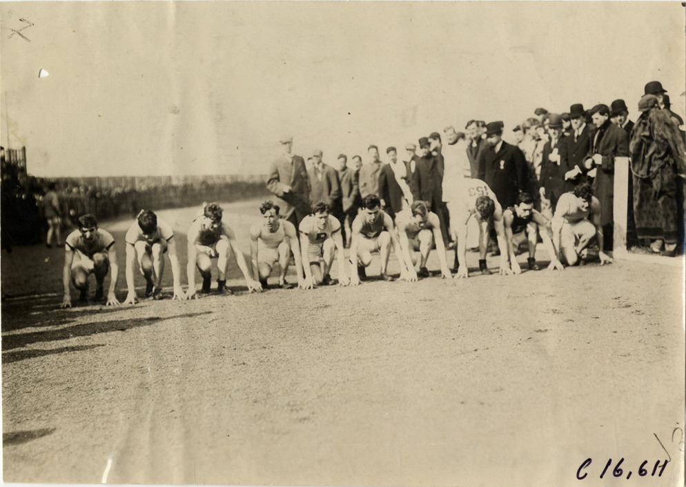 View of runners at start of race at track meet. Spectators and officials in background. Stamped on back: "Spooner & Wells, Inc., photographers, telephones 3472-3473 Columbus, 1931 Broadway, New York." Handwritten on back: "Sporting events--Track and field, 1909."