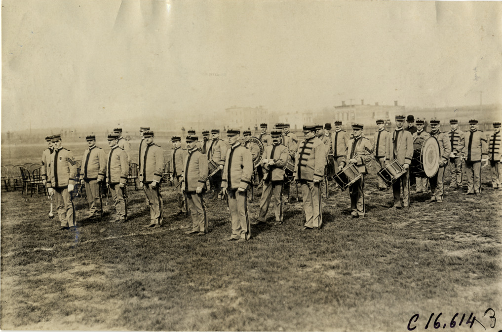 View of New York Letter Carriers' Association Band standing in formation at track meet; musicians wear uniforms. Stamped on back: "Spooner & Wells, Inc., photographers, telephones 3472-3473 Columbus, 1931 Broadway, New York." Handwritten on back: "Sporting events--Track and field, 1909."