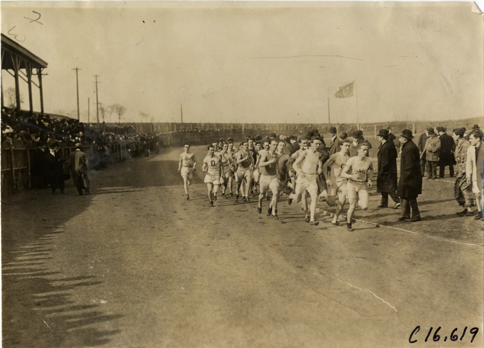 View of runners competing in race at track meet. Officials and spectators on sidelines. Stamped on back: "Spooner & Wells, Inc., photographers, telephones 3472-3473 Columbus, 1931 Broadway, New York." Handwritten on back: "Sporting events--Track and field, 1909."