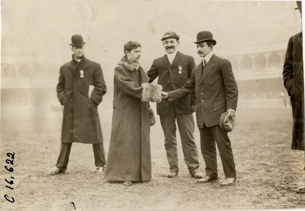 View of runner Dorando Pietri shaking hands with an official at marathon race. Pietri wears long coat with fur collar and cuffs; two officials stand in background. Stamped on back: "Spooner & Wells, Inc., photographers, telephones 3472-3473 Columbus, 1931 Broadway, New York." Handwritten on back: "Dorando, Marathon Derby. Sporting events--Track and field, 1909."