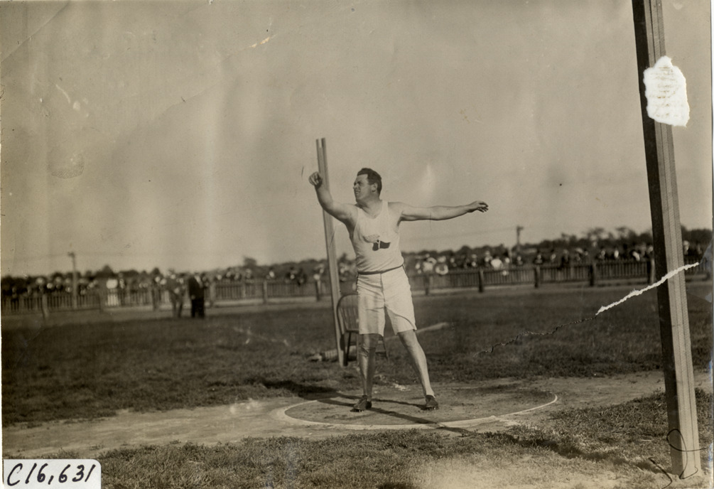 View of Matt McGrath competing in hammer throw at track meet. Handwritten on back: "Matt McGrath. Sporting events--Track and field, 1909."