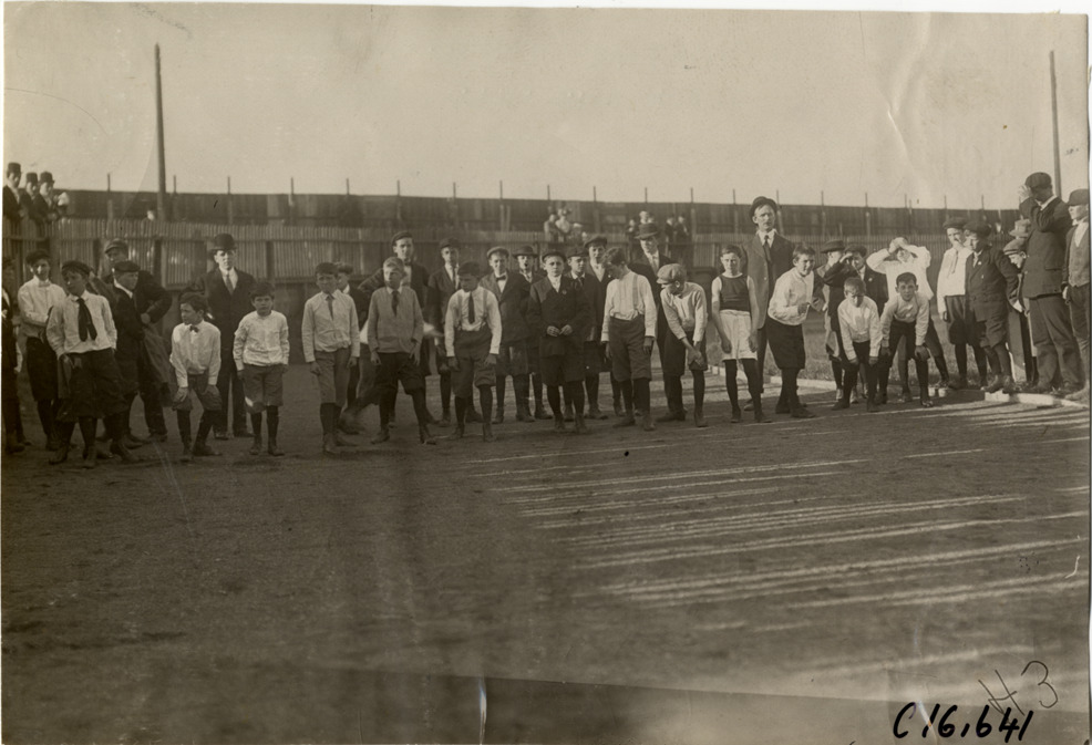 Boys lined up for footrace, Local #37 Bricklayers and Masons games