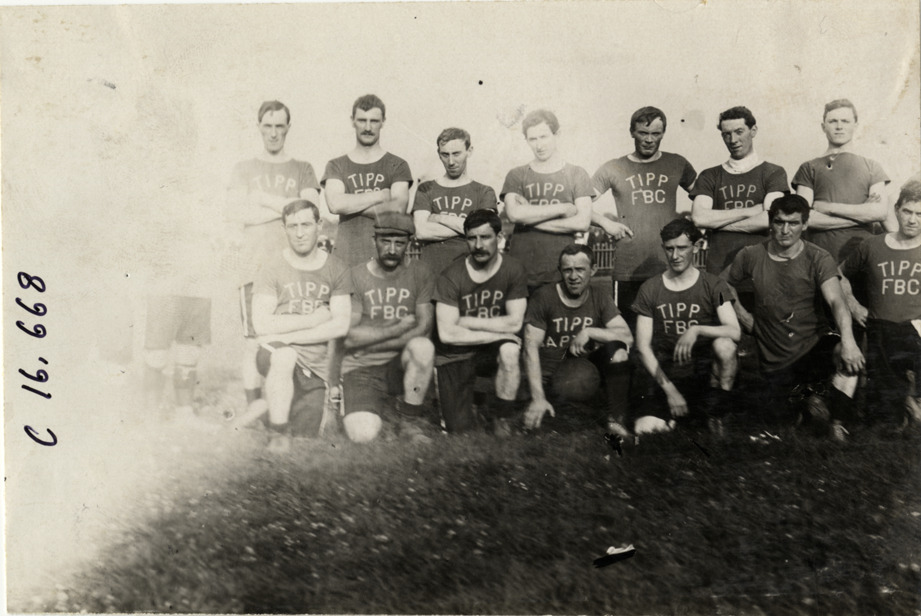 Favorite this☆ Soccer team Description: Group portrait of soccer players. Team wears jerseys with "Tipp FBC" logo; man in front row holds soccer ball. Handwritten on back: "Sporting events--Track and field, 1909." Details Resource ID: na018327 Subject: Soccer teams Soccer players Photographic prints Date Issued: 1909 Format: 1 photographic print ; 4.25 x 6.25 in. Member of: National Automotive History Collection Lazarnick Collection Filing Location: Sporting events--Track and field, 1909 #14 Negative Number: Negative #C16,668 Rights: Physical rights are retained by DPL. Copyright is retained in accordance with U.S. copyright laws.