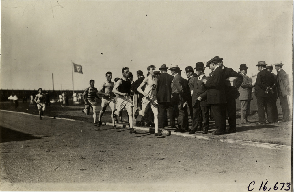 Favorite this☆ Runners competing in race Description: View of runners competing in race at track meet. Officials and spectators watch from sidelines. Handwritten on back: "Sporting events--Track and field, 1909." Details Resource ID: na018332 Subject: Runners (Sports) Running races Photographic prints Date Issued: 1909 Format: 1 photographic print ; 4.5 x 6.75 in. Member of: National Automotive History Collection Lazarnick Collection Filing Location: Sporting events--Track and field, 1909 #14 Negative Number: Negative #C16,673 Rights: Physical rights are retained by DPL. Copyright is retained in accordance with U.S. copyright laws.