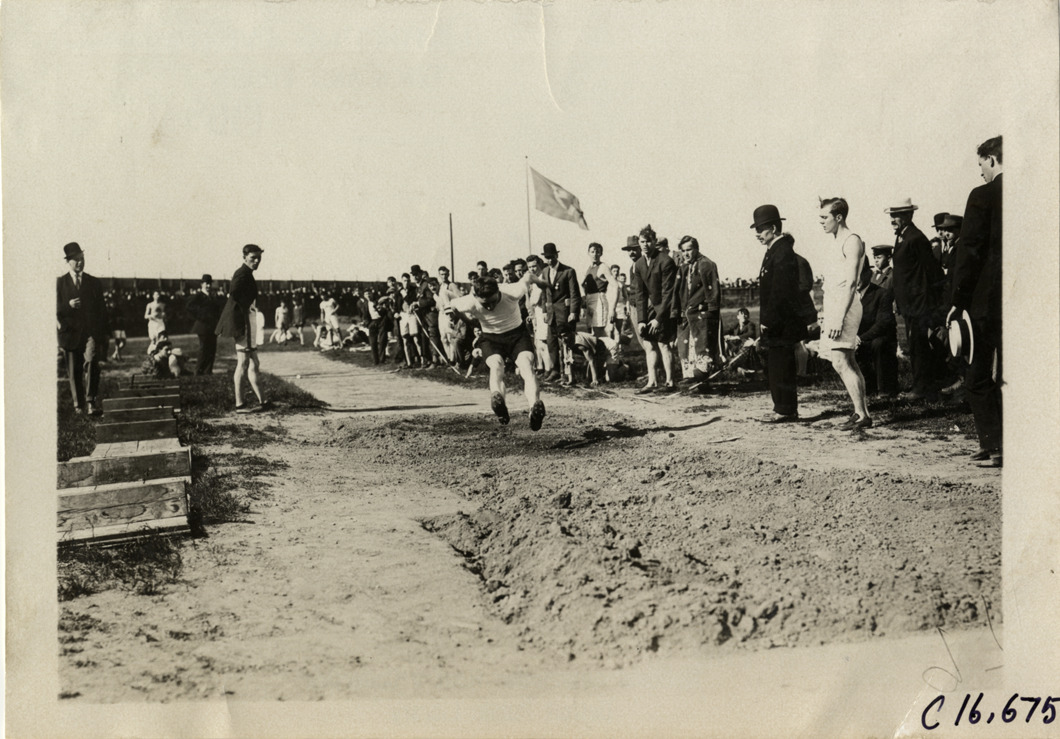 Favorite this☆ Athlete competing in long jump Description: View of athlete competing in long jump or broad jump at track meet. Spectators, athletes and officials watch from sidelines. Handwritten on back: "Sporting events--Track and field, 1909." Details Resource ID: na018334 Subject: Broad jump Track and field athletes Track and field--Tournaments Photographic prints Date Issued: 1909 Format: 1 photographic print ; 5 x 7 in. Member of: National Automotive History Collection Lazarnick Collection Filing Location: Sporting events--Track and field, 1909 #14 Negative Number: Negative #C16,675 Rights: Physical rights are retained by DPL. Copyright is retained in accordance with U.S. copyright laws.
