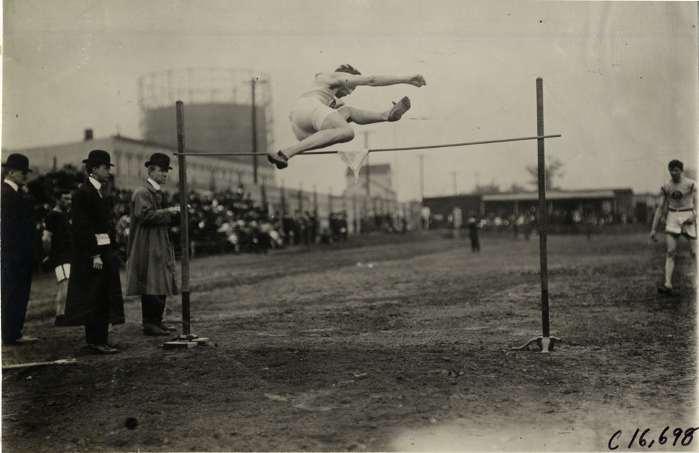 View of athlete competing in high jump at track meet. Officials stand nearby; spectators in background. Handwritten on back: "Sporting events--Track and field, 1909."