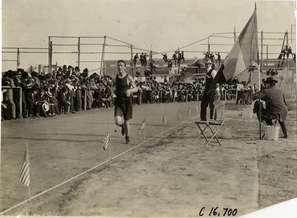 View of runner competing in race at track meet. Officials and spectators watch from sidelines. Handwritten on back: "Sporting events--Track and field, 1909."
