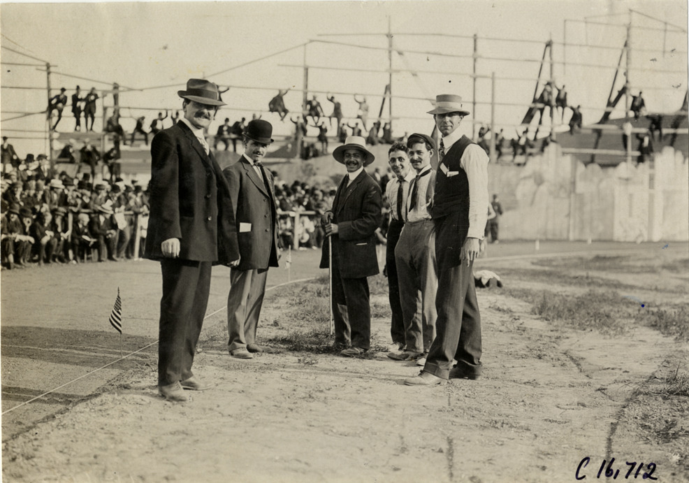 View of group of officials at track meet. Spectators in background. Stamped on back: "Spooner & Wells, Inc., photographers, telephones 3472-3473 Columbus, 1931 Broadway, New York." Handwritten on back: "Sporting events--Track and field, 1909."