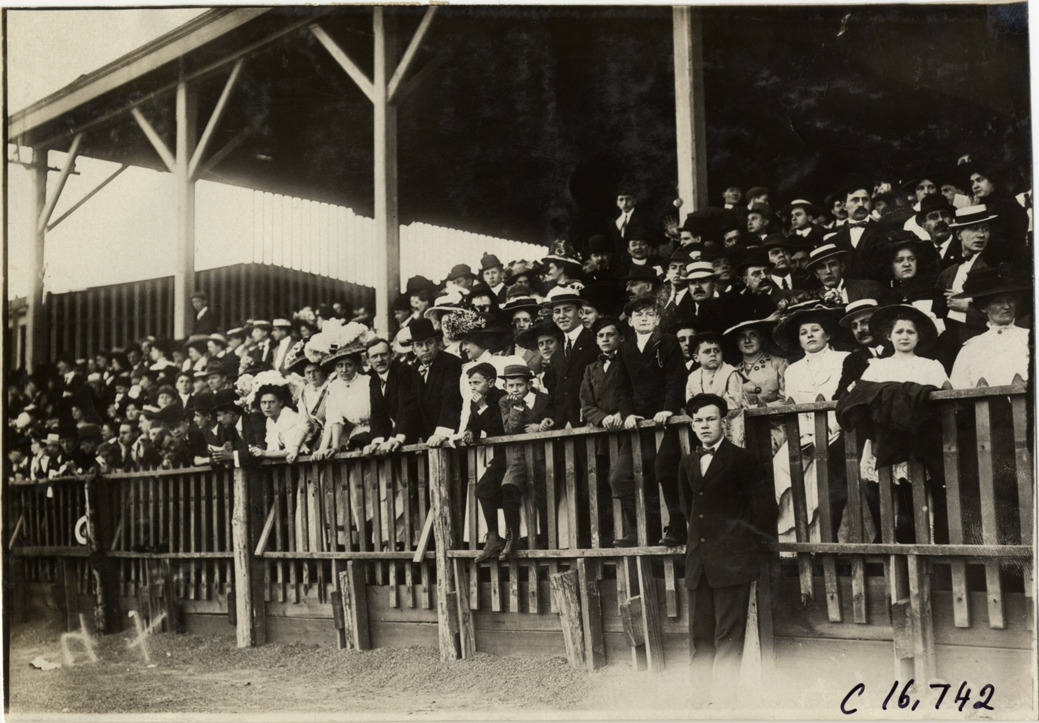 Favorite this☆ Spectators at track meet Description: View of spectators in grandstand at track meet. Handwritten on back: "Sporting events--Track and field, 1909." Details Resource ID: na018401 Subject: Sports spectators Track and field--Tournaments Photographic prints Date Issued: 1909 Format: 1 photographic print ; 5 x 7 in. Member of: National Automotive History Collection Lazarnick Collection Filing Location: Sporting events--Track and field, 1909 #17 Negative Number: Negative #C16,742 Rights: Physical rights are retained by DPL. Copyright is retained in accordance with U.S. copyright laws.