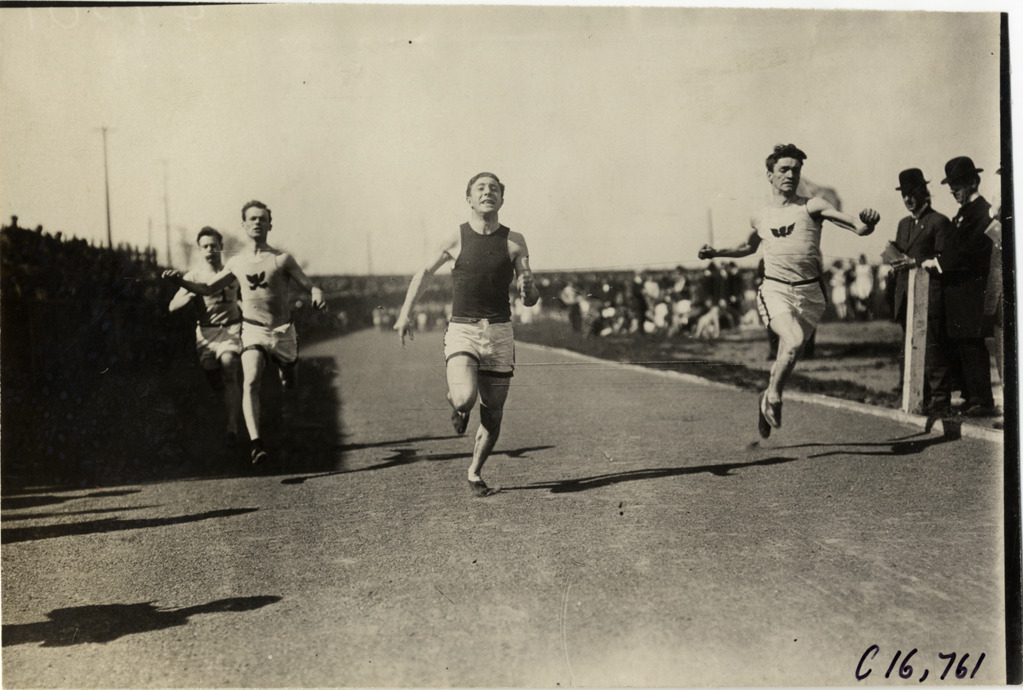 Favorite this☆ Runners competing in race Description: View of runners competing in race at track meet. Officials and spectators watch from sidelines. Handwritten on back: "Sporting events--Track and field, 1909." Details Resource ID: na018420 Subject: Runners (Sports) Running races Photographic prints Date Issued: 1909 Format: 1 photographic print ; 5 x 6.75 in. Member of: National Automotive History Collection Lazarnick Collection Filing Location: Sporting events--Track and field, 1909 #18 Negative Number: Negative #C16,761 Rights: Physical rights are retained by DPL. Copyright is retained in accordance with U.S. copyright laws.