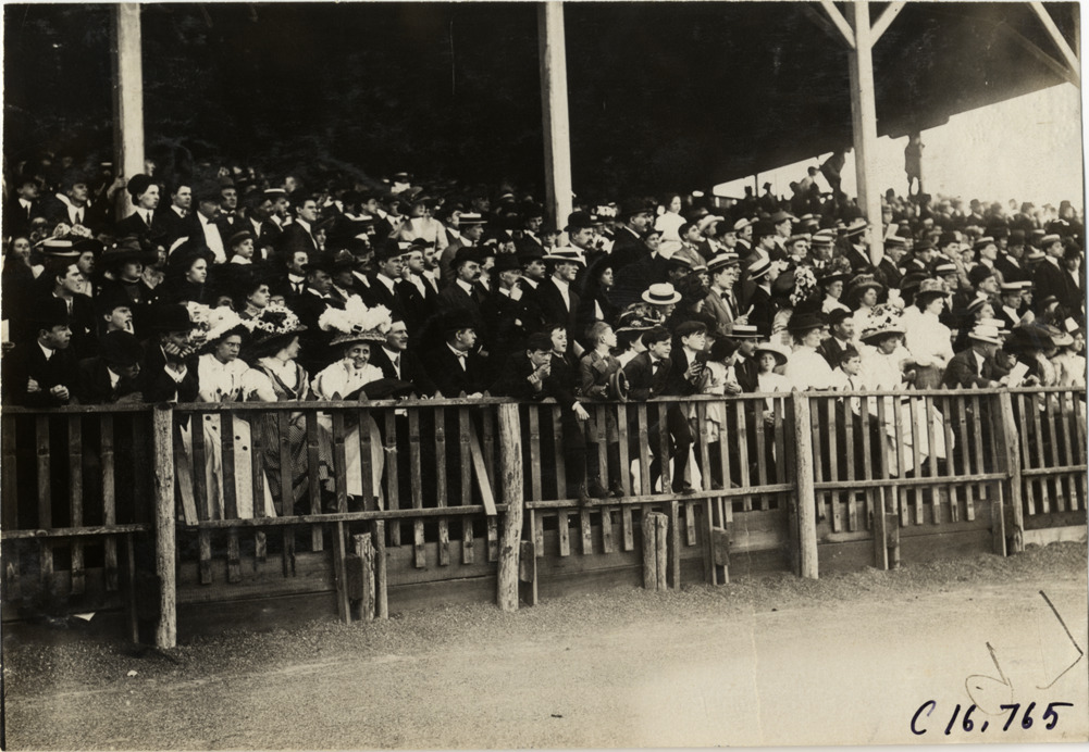 Favorite this☆ Spectators at track meet Description: View of spectators in grandstand at track meet. Handwritten on back: "Sporting events--Track and field, 1909." Details Resource ID: na018424 Subject: Sports spectators Track and field--Tournaments Photographic prints Date Issued: 1909 Format: 1 photographic print ; 4.75 x 6.75 in. Member of: National Automotive History Collection Lazarnick Collection Filing Location: Sporting events--Track and field, 1909 #18 Negative Number: Negative #C16,765 Rights: Physical rights are retained by DPL. Copyright is retained in accordance with U.S. copyright laws.