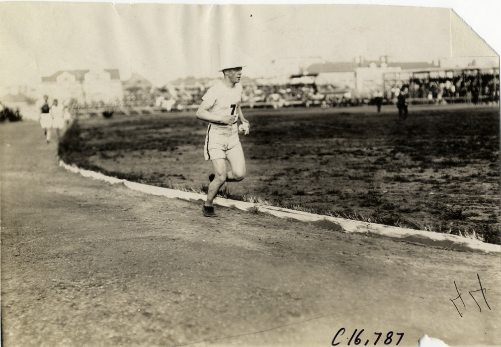 View of runner competing in race at track meet. Handwritten on back: "Sporting events--Track and field, 1909."