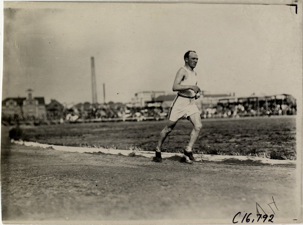 View of runner competing in race at track meet. Handwritten on back: "Sporting events--Track and field, 1909."