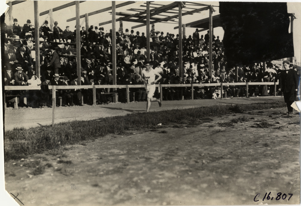 Favorite this☆ Runner James Crowley competing in marathon race Description: View of runner James Crowley competing in marathon race. Spectators in grandstand in background. Handwritten on back: "Sporting events--Track and field, 1909." Details Resource ID: na018466 Subject: Runners (Sports) Sports spectators Marathon running--Competitions Photographic prints Date Issued: 1909 Format: 1 photographic print ; 4.75 x 6.75 in. Member of: National Automotive History Collection Lazarnick Collection Filing Location: Sporting events--Track and field, 1909 #20 Negative Number: Negative #C16,807 Rights: Physical rights are retained by DPL. Copyright is retained in accordance with U.S. copyright laws.