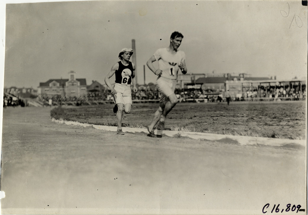 Favorite this☆ Runners James Crowley and George Obermeyer competing in marathon race Description: View of runner James Crowley, followed by George Obermeyer, in marathon race. Handwritten on back: "Sporting events--Track and field, 1909." Details Resource ID: na018468 Subject: Runners (Sports) Marathon running--Competitions Photographic prints Date Issued: 1909 Format: 1 photographic print ; 5 x 7 in. Member of: National Automotive History Collection Lazarnick Collection Filing Location: Sporting events--Track and field, 1909 #20 Negative Number: Negative #C16,809 Rights: Physical rights are retained by DPL. Copyright is retained in accordance with U.S. copyright laws.