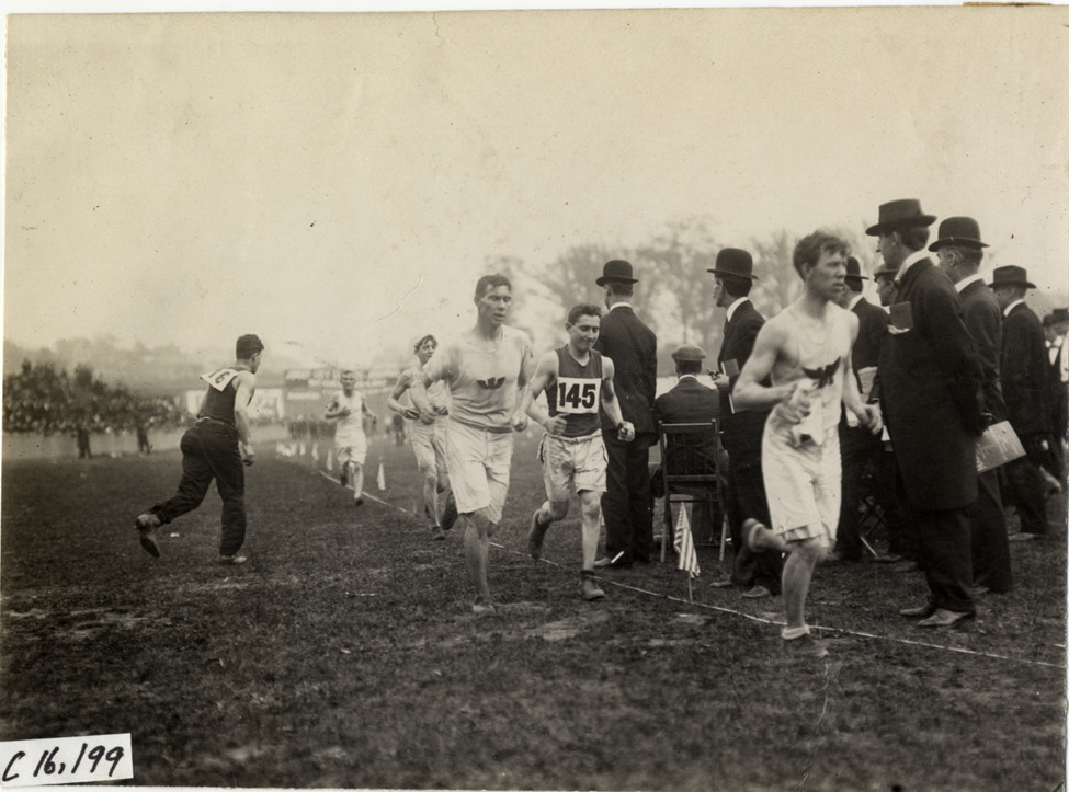 View of James Crowley, Edwin H. White and several unidentified runners in 1909 New Jersey Marathon. Officials watch from sidelines. Stamped on back: "Spooner & Wells, Inc., photographers, telephones 3472-3473 Columbus, 1931 Broadway, New York." Handwritten on back: "Sporting events--Track and field (New Jersey Marathon), 1909."