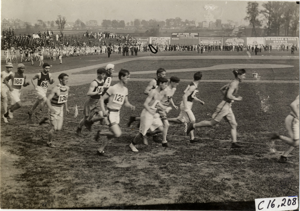 View of runners competing in the 1909 New Jersey Marathon. Spectators in background. Stamped on back: "Spooner & Wells, Inc., photographers, telephones 3472-3473 Columbus, 1931 Broadway, New York." Handwritten on back: "N.J. Marathon, 5/15/09. Sporting events--Track and field (New Jersey Marathon), 1909."