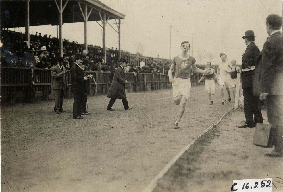 Runners competing in race at track and field event during the 1909 New Jersey Marathon