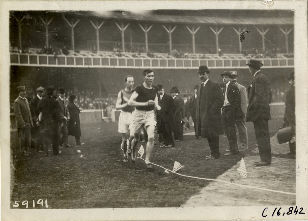 View of Jim Crowley and unidentified runner competing in marathon race. Officials watch from sidelines; grandstand in background. Stamped on back: "Spooner & Wells, Inc., photographers, telephones 3472-3473 Columbus, 1931 Broadway, New York." Handwritten on back: "Sporting events--Track and field, 1910."