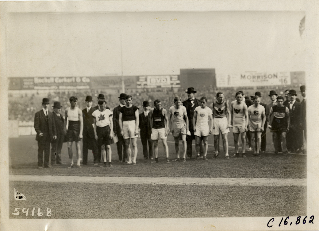 View of runners lined up for start of marathon race. Officials and spectators in background. Stamped on back: "Spooner & Wells, Inc., photographers, telephones 3472-3473 Columbus, 1931 Broadway, New York." Handwritten on back: "Sporting events--Track and field, 1910."
