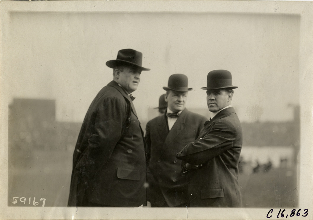 View of three officials at marathon race. Stamped on back: "Spooner & Wells, Inc., photographers, telephones 3472-3473 Columbus, 1931 Broadway, New York." Handwritten on back: "Sporting events--Track and field, 1910."