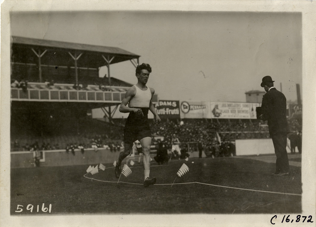 View of runner Hans Holmer competing in marathon race. Officials and spectators in background. Stamped on back: "Spooner & Wells, Inc., photographers, telephones 3472-3473 Columbus, 1931 Broadway, New York." Handwritten on back: "Hans Holmer. Sporting events--Track and field, 1910."