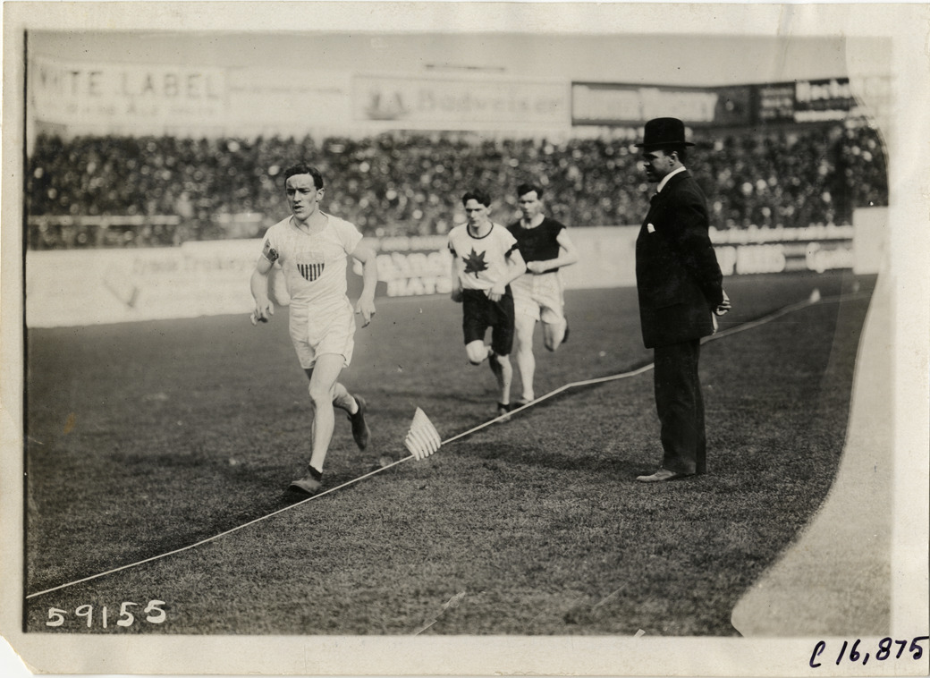 View of runners competing in marathon race. Official watches from sidelines; grandstand in background. Stamped on back: "Spooner & Wells, Inc., photographers, telephones 3472-3473 Columbus, 1931 Broadway, New York." Handwritten on back: "Sporting events--Track and field, 1910."