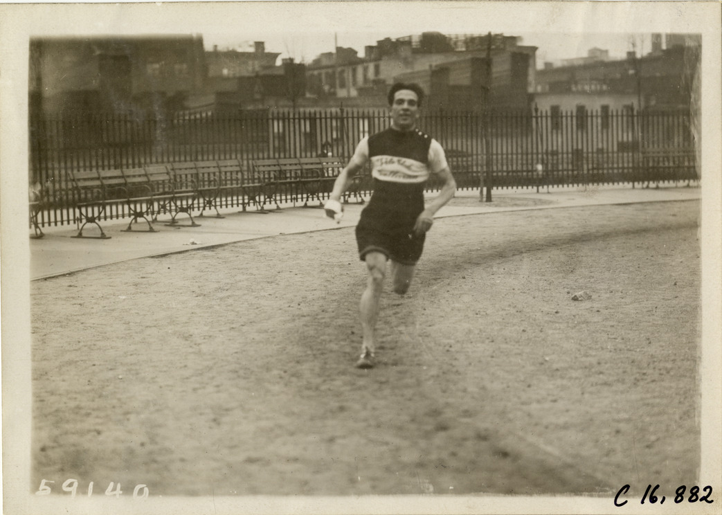 View of runner competing in marathon race. Runner wears jersey with "Velo Club, Gallarate" logo; fence in background. Stamped on back: "Spooner & Wells, Inc., photographers, telephones 3472-3473 Columbus, 1931 Broadway, New York." Handwritten on back: "Sporting events--Track and field, 1910."