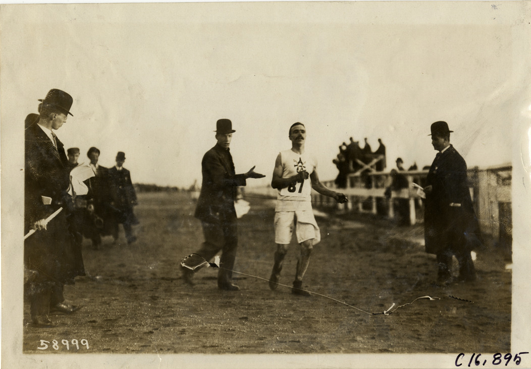 View of runner with officials on track during marathon race. Stamped on back: "Spooner & Wells, Inc., photographers, telephones 3472-3473 Columbus, 1931 Broadway, New York." Handwritten on back: "Sporting events--Track and field, 1910."