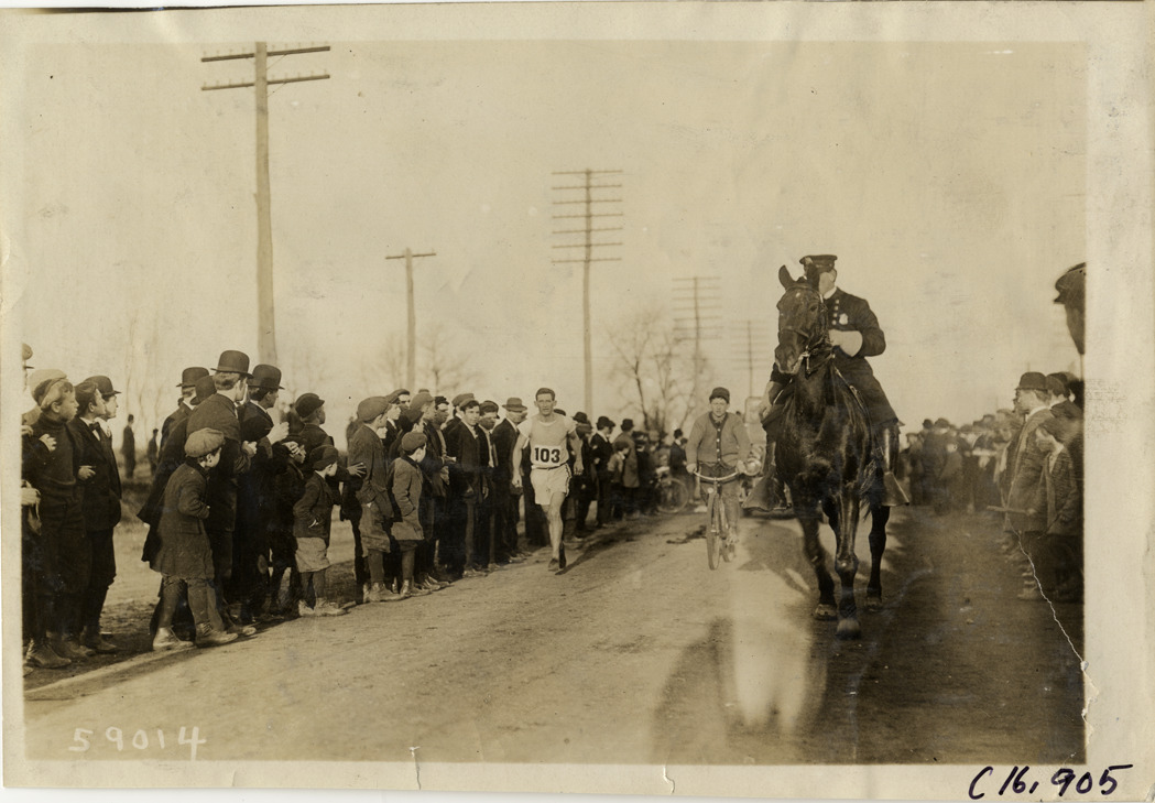 View of bicyclist following runner in marathon race. Policeman on horseback in foreground; spectators watch from roadside. Stamped on back: "Spooner & Wells, Inc., photographers, telephones 3472-3473 Columbus, 1931 Broadway, New York." Handwritten on back: "Sporting events--Track and field, 1910."