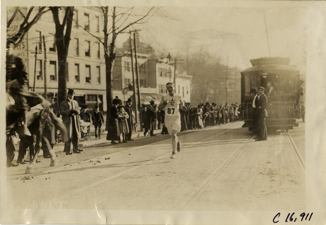 View of runner competing in marathon race. Streetcar in background; spectators watch from roadside. Stamped on back: "Spooner & Wells, Inc., photographers, telephones 3472-3473 Columbus, 1931 Broadway, New York." Handwritten on back: "Sporting events--Track and field, 1910."