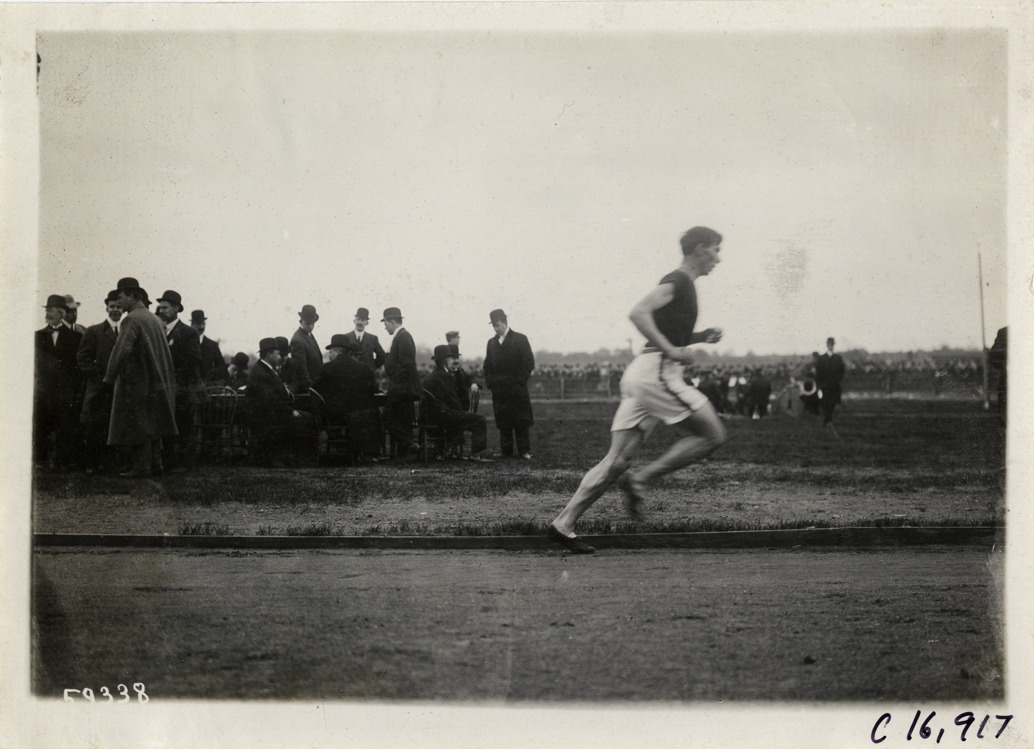 View of marathon runner James Crowley competing in marathon race. Officials gathered around table in background. Stamped on back: "Spooner & Wells, Inc., photographers, telephones 3472-3473 Columbus, 1931 Broadway, New York." Handwritten on back: "Sporting events--Track and field, 1910."
